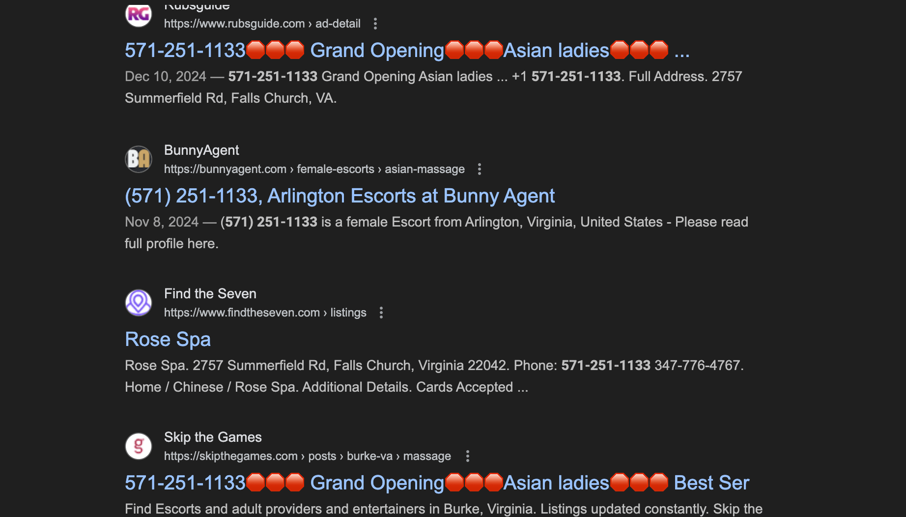 A search of the spa’s recent phone numbers turns up explicit advertisements on webpages for escorts, linked to the address.