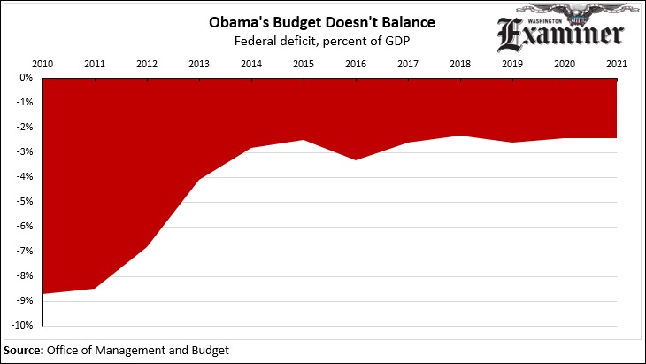 You might expect record high-taxes would lead to a balanced budget. Not so. The deficit, as a portion of GDP, would fall from 2016’s 3.3 percent, but level out at 2.4 percent by 2020 and 2021. In raw numbers, that means a $5.5 billion deficit. Tax revenues rise almost two percentage points under Obama’s budget from FY 2016 to 2021, but spending also rises by one point, so a deficit remains.