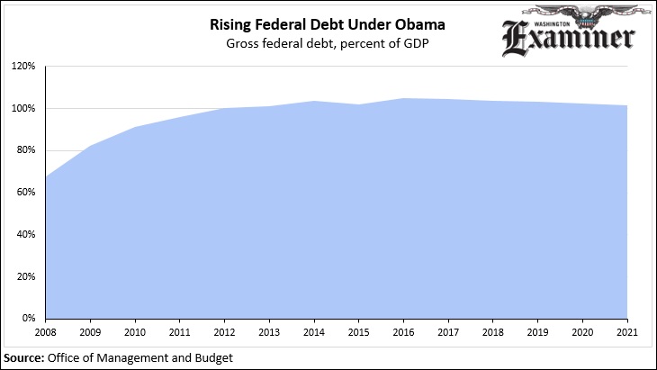 A deficit means more debt. Under Obama’s budget, gross federal debt would continue to rise, surpassing $20 trillion by the end of 2017. Even if everything in Obama’s budget were passed into law and projections were perfect, debt would still reach $23.2 trillion by the end of 2021. If you compare federal debt with the size of the economy, debt actually grows more slowly than the economy. Gross federal debt as a percentage of GDP would fall from 105.2 percent in 2016 to 101.4 percent in 2021. Still, that is well more than the debt level Obama inherited: 67.7 percent of GDP at the end of 2008.