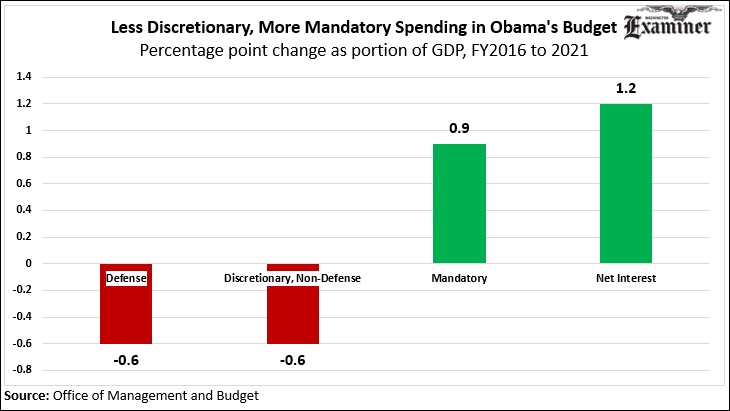 Although federal spending rises under Obama’s budget, that doesn’t mean everything gets a boost. In fact, defense and nondefense discretionary spending are both cut by 0.6 percentage points as a portion of GDP from 2016 to 2021. The spending hikes in Obama’s budget actually come from mandatory spending, like entitlements, and debt interest payments. Mandatory spending rises by 0.9 percentage points, while net interest payments rise by 1.2 percentage points.