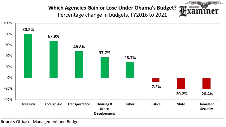 Which agencies gain and lose in the Obama budget? There’ are a lot of winners, and only a few losers. Both the Department of State and the Department of Homeland Security get their budgets cut by about one-fifth. The Department of Justice is also one of the few departments to get cut, receiving a 7.2 percent budget cut from the present to 2021. Although the Department of State gets cut, foreign aid, or international assistance programs, gets a 68 percent boost. The Department of the Treasury is the biggest winner, receiving an 80 percent boost.