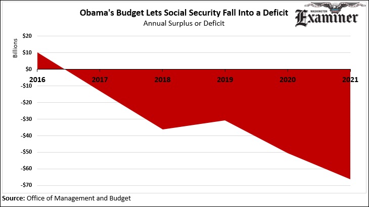 For the first time since the early 1980s, the Social Security retirement trust fund is about to fall into a deficit, and Obama’s budget wouldn’t be able to stop it. The trust fund will take in about $10.2 billion on net in 2016, but by 2021 it will lose $66.2 billion on net. The trust fund’s income will rise by almost $200 billion in that time frame, but benefit payments will rise by $273 billion. The latest projections from the nonpartisan Congressional Budget Office estimate that the retirement trust fund will run out of funds in 2030. At that time, the fund would only be able to pay out as much as it takes in, about 80 percent of the promised benefits.
