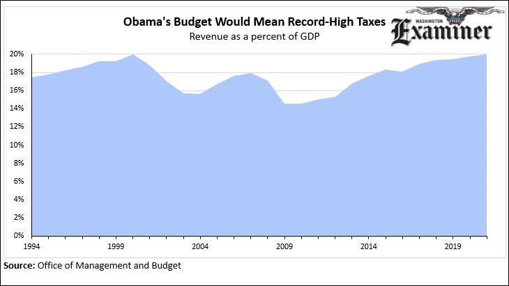 The federal government will collect more tax dollars in 2016 than it has ever before: $3.3 trillion. Under Obama’s budget, that would rise to a new record high: $4.6 trillion. Those are raw numbers that aren’t adjusted for inflation. But even if you compare taxes as a portion of the economy, Obama’s budget would raise taxes to a historic high of 20 percent of GDP. Bill Clinton’s penultimate budget, FY 2000, was the only other time in history tax receipts were so high.