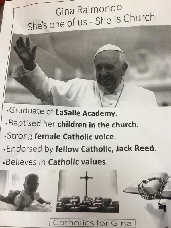 Raimondo’s churchy flyer is likely intended to blunt criticism of her support for abortion by Bishop Thomas Tobin and officials of the Diocese of Providence. La Salle Academy, the Roman Catholic preparatory school she attended, removed her portrait from its wall of notable alumni this year after she attended a Planned Parenthood fundraiser and offered a full-throated defense of a “woman’s right to choose.”