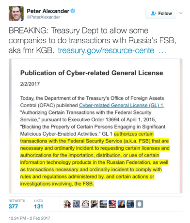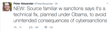 Before these hot takes had a chance to cool, however, NBC’s Alexander tweeted out a rather important follow-up to his initial supposed scoop: “NEW: Source familiar w sanctions says it’s a technical fix, planned under Obama, to avoid unintended consequences of cybersanctions.”