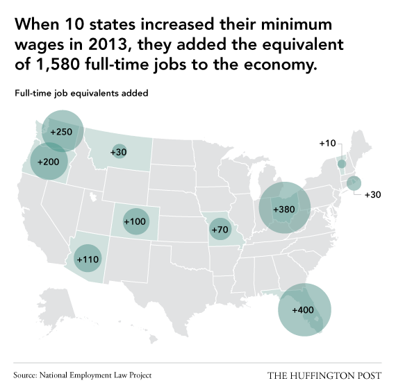 One could also believe Huffington Post’s reporting of the economic benefits of minimum wage, but those benefits seem like more of a correlation than anything else. For example, HuffPo presented a chart showing job increases (however small) in states that increased the minimum wage. However, the chart doesn’t show how many jobs were created in states that didn’t increase the minimum wage and doesn’t note whether other factors played a role in the job increases. But weak correlations and unanswered questions make for good stories.