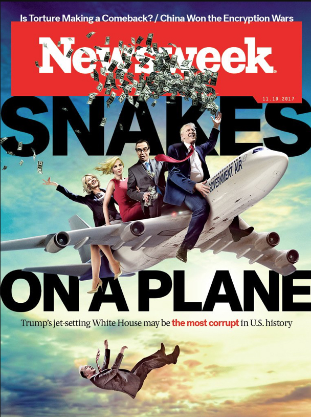 The inclusion of Mnuchin, Linton and Price on Newsweek’s “jet-setting” cover artwork, which bears the none-too-subtle caption “Snakes on a Plane,” makes sense considering they’ve all faced scandals involving taxpayer-funded air travel.