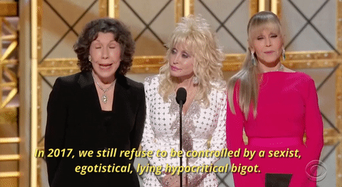 Before the trio announced the winner, however, they reminisced on their movie and its message. Tomlin cut in to emphasize that, “In 2017, we still refuse to be controlled by a sexist, egotistical, lying, hypocritical bigot.”