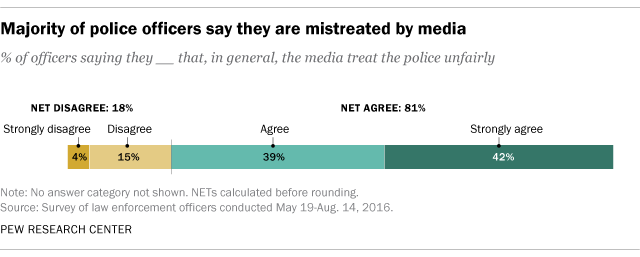 “About eight-in-ten officers (81 percent) who work in departments of 100 or more sworn officers say the media generally treat the police unfairly, according to the survey,” Pew Research reports. “Just 18% of officers disagree. About four-in-ten officers (42 percent) strongly agree that the media are unfair to police.”