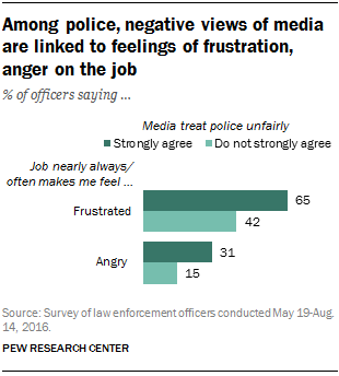 “Roughly two-thirds of officers (65 percent) who strongly agree that the media treat police unfairly say their work always or often makes them feel frustrated,” Pew Research reports, “and about one-in-three (31 percent) say it makes them feel angry.”