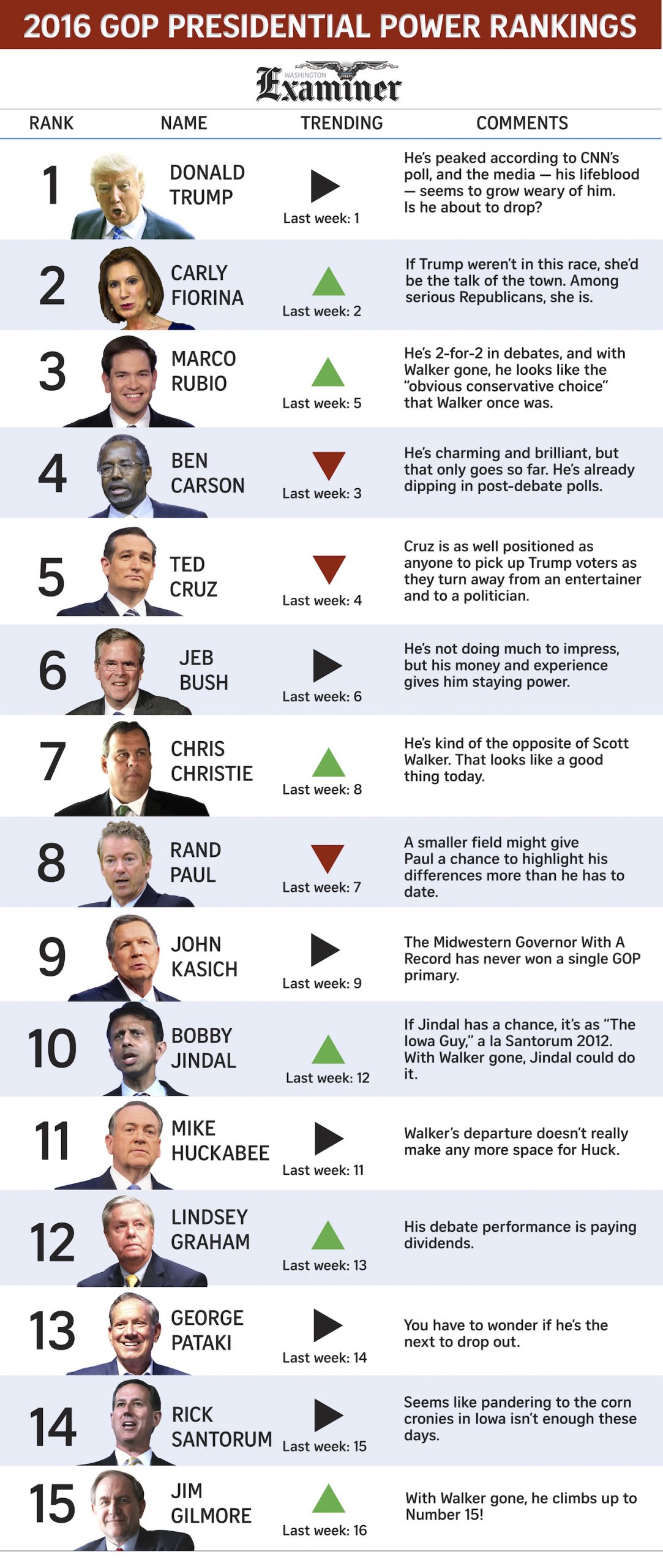 Walker had dropped multiple spots in each of our Power Rankings. Now he’s gone. Here’s the current line-up of the most significant GOP candidates to the least.