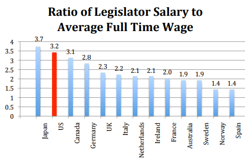 The average full-time worker makes $55,000. Congressmen and senators make 3.2 times that, plus a health and retirement package far better than what most workers get. According to a 2014 study by the Taxpayers Protection Alliance, Japan is the only nation in the industrialized world that pays legislators in greater disproportion to the population they govern.
