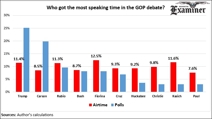 On the other hand, if you think higher-polling candidates should have gotten more speaking time, Donald Trump didn’t speak enough, nor did Ben Carson. For example, Carson averages 20 percent in the polls used for the debate, but he only got 9 percent of the speaking time.