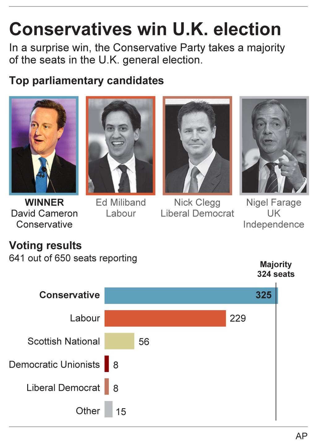 Big surprises in Thursday’s British election. For weeks the pre-election polls showed a statistical tie in popular votes between Prime Minister David Cameron’s Conservative Party and the Labour opposition led by Ed Miliband. It was universally agreed that neither party could reach a 326-vote majority in the House of Commons. A prominent British political website projected that Conservatives would get 280 seats and Labour 274.