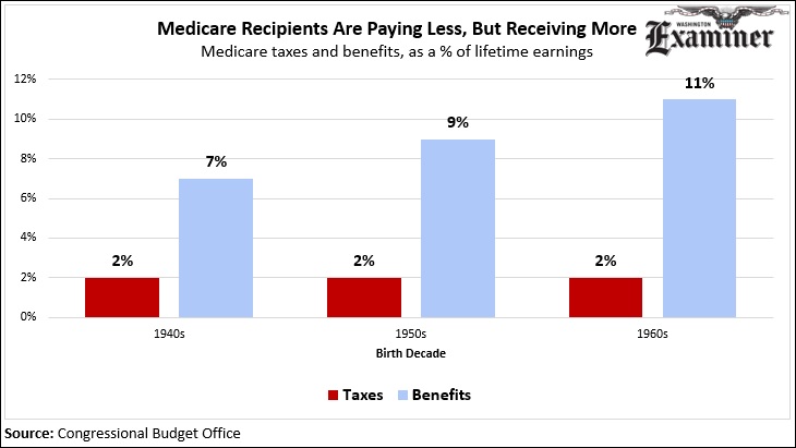 The aging population means that people are eligible for more benefits, even though they paid about the same in taxes as someone who doesn’t live as long. A 75-year-old paid about 2 percent of her lifetime earnings to Medicare and received about 7 percent of her lifetime earnings in benefits. For comparison, a 46 year old today will have paid about the same portion in taxes, but will receive 11 percent of his lifetime earnings in benefits by the time he dies. Growing benefits are causing Medicare’s financial problems, not a lack of tax revenue.