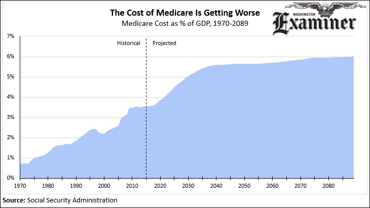 That’s why Medicare’s cost is exploding. In 2040, the annual cost of Medicare will stabilize at about 5.6 percent of the economy. Today it costs a full two percentage points less than it will then. The cost of Medicare has doubled since 1988.