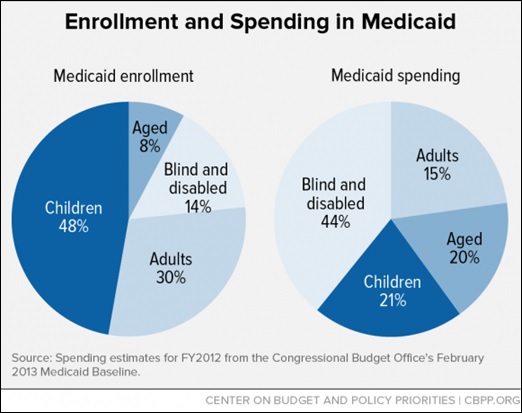 This graph from the Center on Budget and Policy Priorities shows the difference between who’s enrolled in Medicaid and who actually gets the most help from it. Almost half of Medicaid’s enrollees are children, but just one-fifth of Medicaid’s spending goes to kids. Meanwhile, the aged take up 8 percent of enrollees but receive 20 percent of all spending. The blind and disabled receive three times their portion of spending compared to their portion of enrollment.