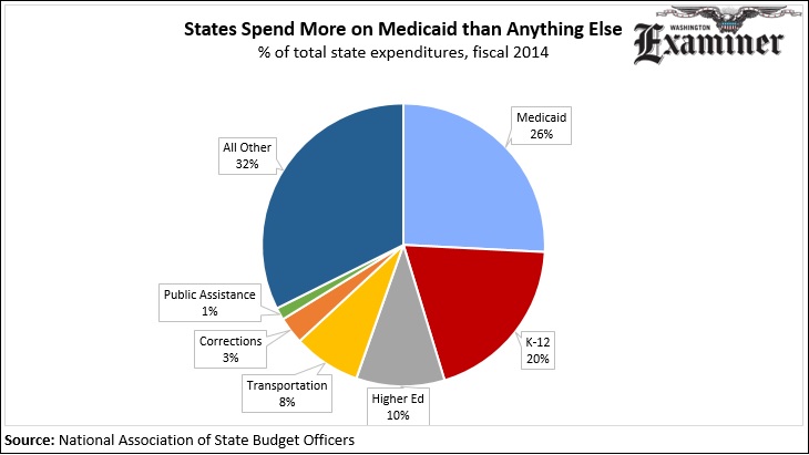 State governments spend more on Medicaid than they spend on anything else. Twenty-six cents of every dollar spent by state governments goes to Medicaid, while 20 cents goes to K-12 education. Higher education receives 10 cents and transportation gets 8 cents.