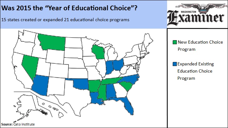 In 2011, 13 states enacted new school choice programs or expanded existing ones. In 2015, 15 states created or expanded school choice programs, as tallied by the libertarian Cato Institute’s Jason Bedrick.