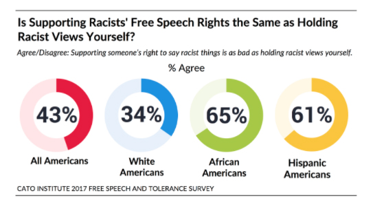 In a new Cato Institute survey, the libertarian think tank found that 43 percent of Americans believe supporting free speech of racists is tantamount to sharing the views of those racist. For instance, finding it objectionable to censure Richard Spencer is now equivalent to marching alongside the half-whit white supremacist.