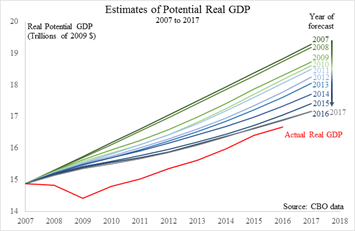 The policies of the Obama administration diminished the economy’s output potential. Each year since 2007, the Congressional Budget Office lowered its projection of potential GDP, as depicted in the nearby chart. Annual GDP is now more than $2 trillion lower than it might have been without the constraints caused by the Obama administration’s policies.