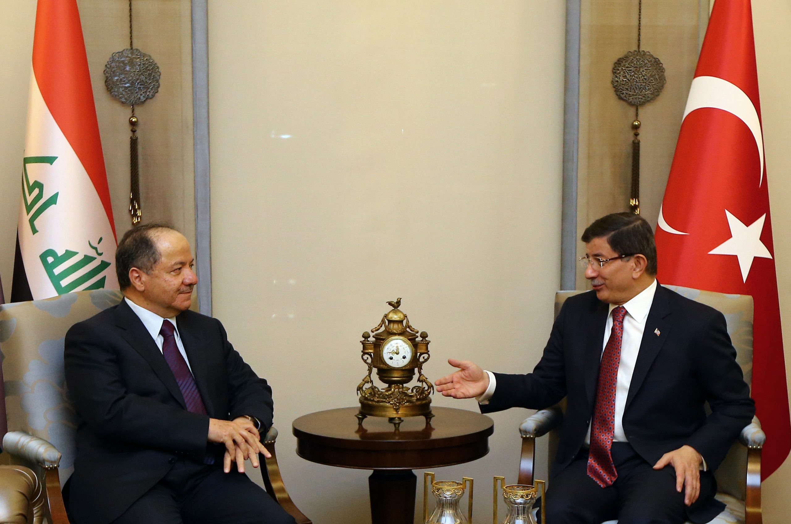 Turkish Prime Minister Ahmet Davutoglu, right, and President of Iraq’a northern Kurdish region, Massoud Barzani, speak during a meeting in Ankara, Turkey. Davutoglu defended his country’s deployment of additional forces to Iraq last week, saying it was an “act of solidarity” with Iraq’s fight against the Islamic State group. (AP Photo)