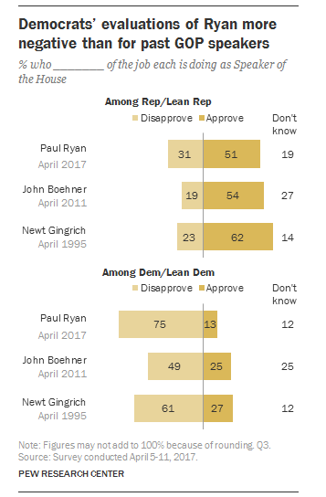 Pew Research Center’s newest study of survey data, titled Public Dissatisfaction with Washington Weighs on the GOP, contains one data point I never thought I’d see. Among Democratic voters, the disapproval rating for House Speaker Paul Ryan (75 percent) is substantially higher today than Newt Gingrich’s was in April 1995 (61 percent), a few months after Republicans took over Congress in the 1994 elections and Gingrich was elected speaker.