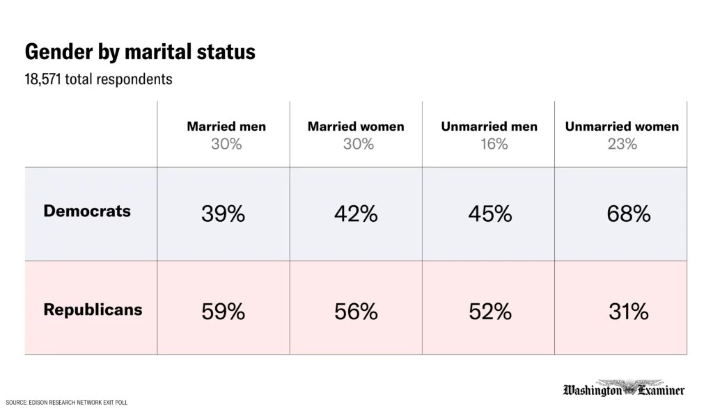 Married men, married women, and single men, all narrowly support the Republican Party. It is unmarried women who are the lone outlier keeping the Democratic Party afloat. Democrats have become the party of the single woke female.