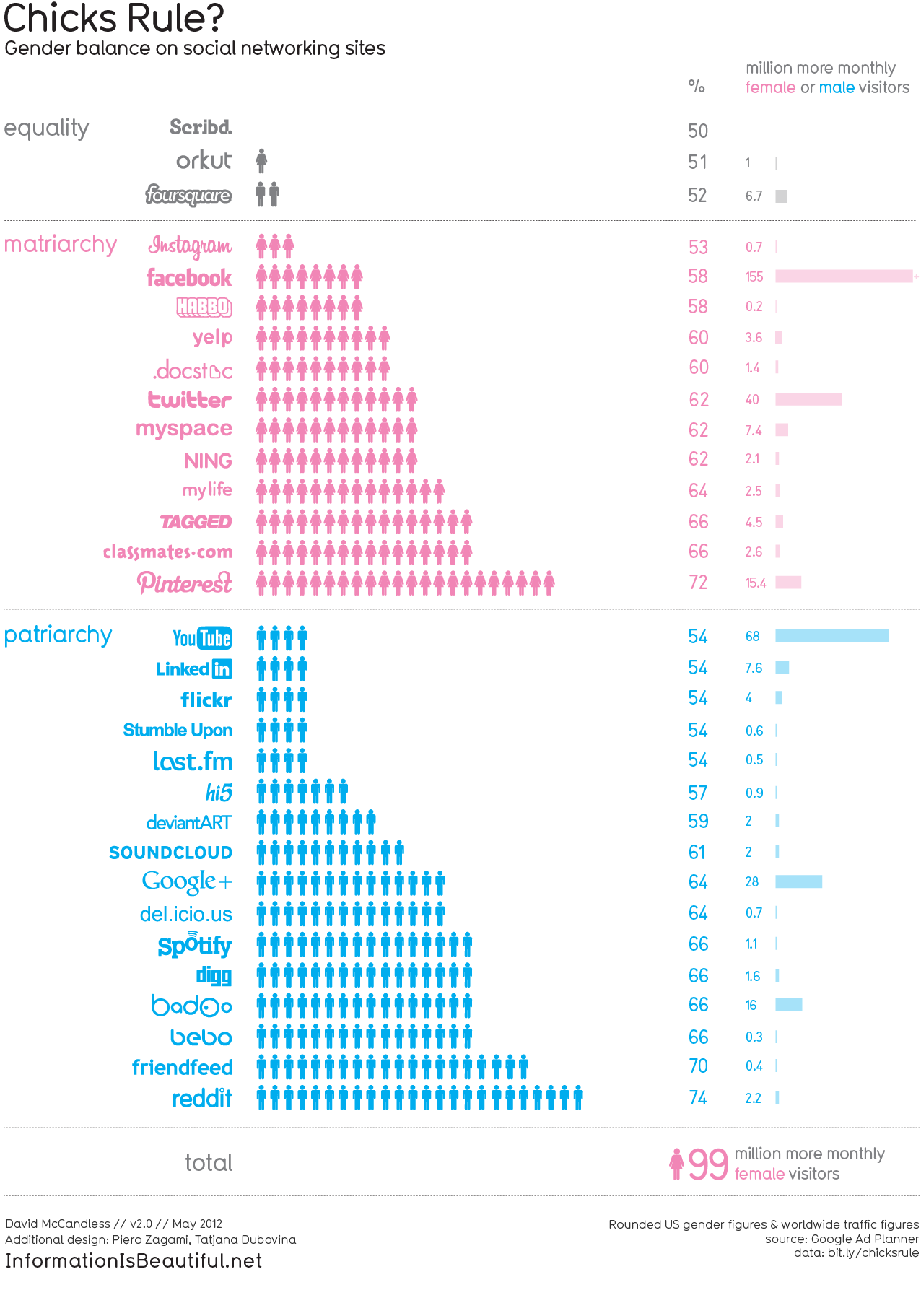 The Pew report also found little difference in usage between genders (70 percent male, 74 percent female), but an infographic from Information is Beautiful breaks down what social networking sites are used most by each gender: