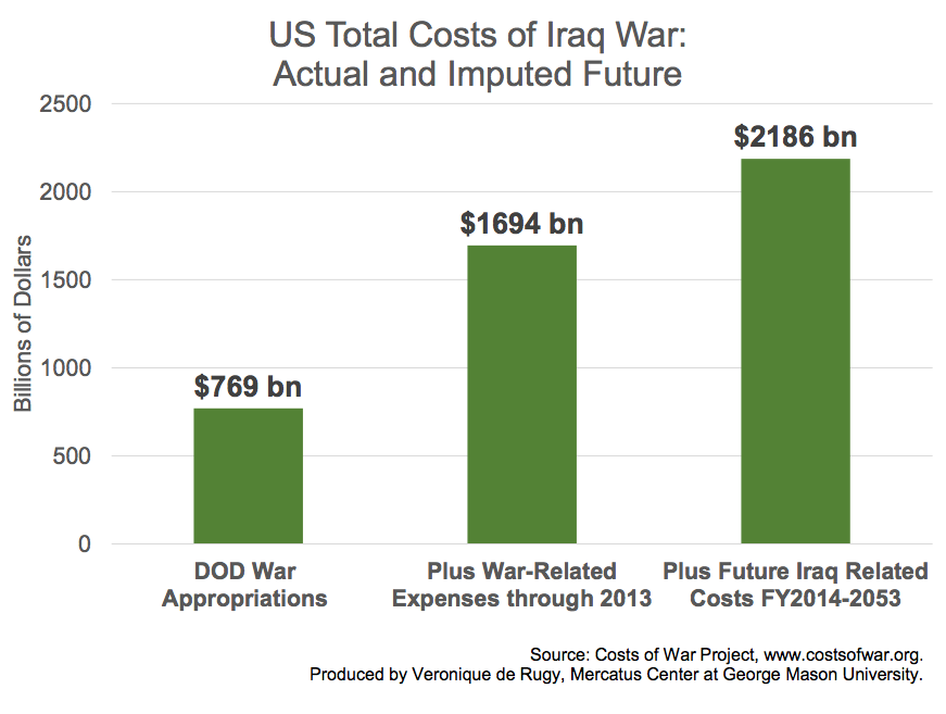 As Seth Cline of U.S. News and World Report pointed out earlier this year, “the Bush administration estimated the [Iraq] war would cost $50 to $60 billion, including the costs of reconstruction and clean up. As of 2013, the Cost of War Project estimates the war has cost $1.7 trillion — nearly 30 times the pre-war estimate.”
