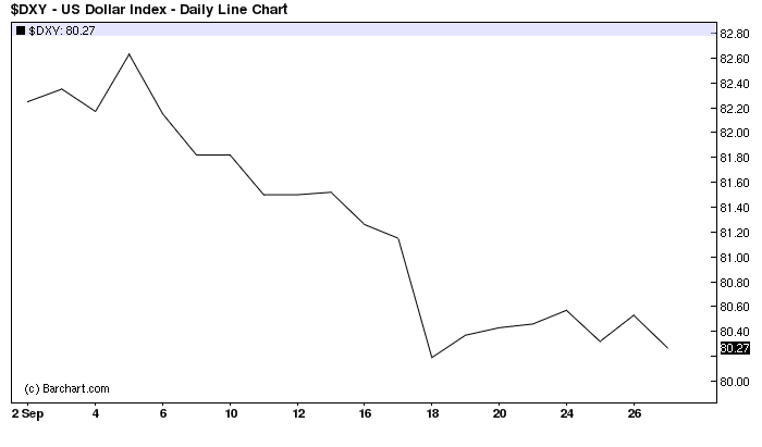 The dollar, on the other hand, remained relatively steady. Here it is against a basket of currencies: