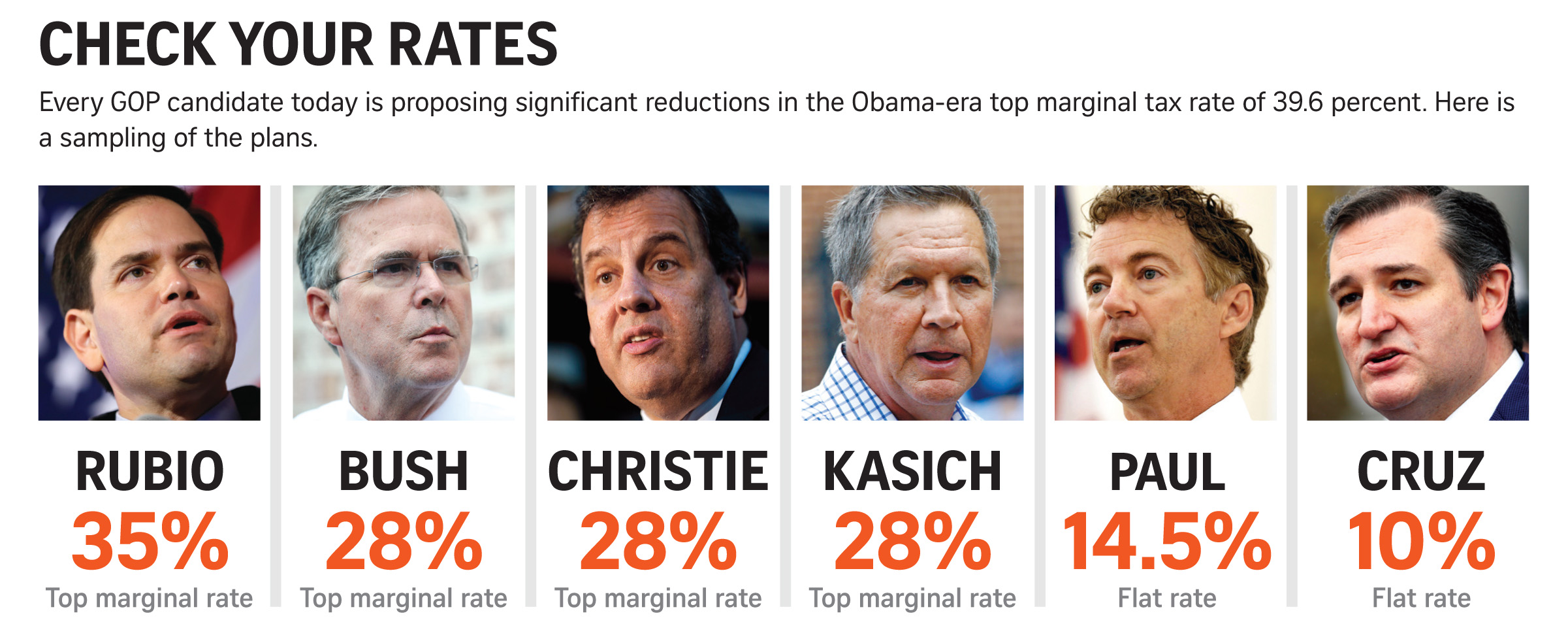 Others go further. Jeb Bush, Chris Christie and John Kasich, often viewed as establishment candidates, want to roll back rates to their lowest level under Reagan, 28 percent. Paul’s target is a flat 14.5 percent rate.