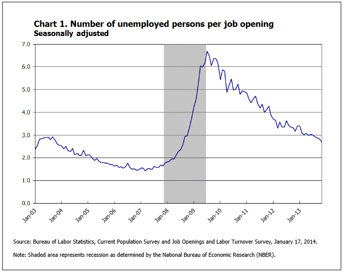 The number of unemployed workers for every job opening, which hovered near 1.5 before the crisis hit, totaled 2.7 in November. That high number, however, represents significant if slow improvement over the course of the recovery. The ratio peaked near seven in mid-2009.