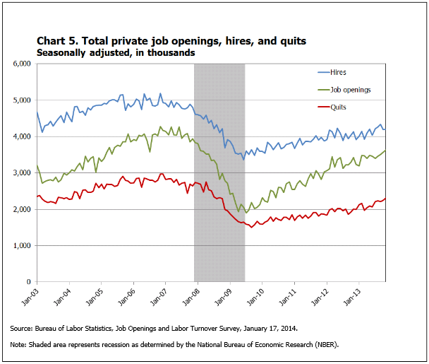 In recent months, Federal Reserve officials have indicated a heightened interest in JOLTS data as a complement to the unemployment rate in understanding the state of the job market. The labor force participation rate has fallen to a decades-low 62.8 percent, suggesting that the labor market is weaker than the quickly falling headline unemployment rate of 6.7 percent would suggest. Having previously set 6.5 percent unemployment as a threshold for raising short-term interest rates from zero, the Fed has signaled that they now will look to other indicators such as the JOLTS for additional hints of recovery.