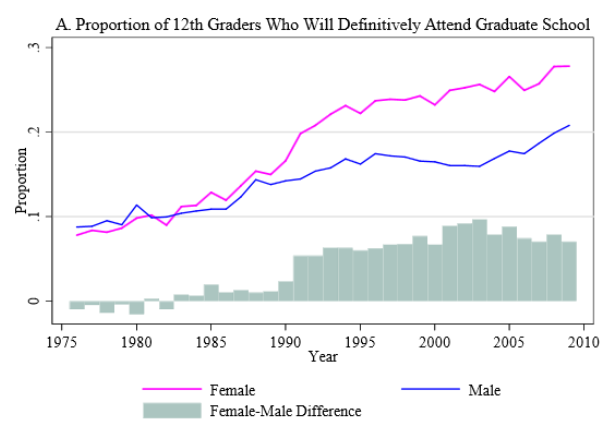 The biggest factor in the rise in girls’ high school achievements has been the increase since the 1970s in the number of girls who plan to attend graduate school, the authors conclude. They write that their findings “show that the predominance of girls at the top of the GPA distribution is rooted in their higher educational expectations, themselves linked to career plans that include a graduate degree (such a law or medical degree).”