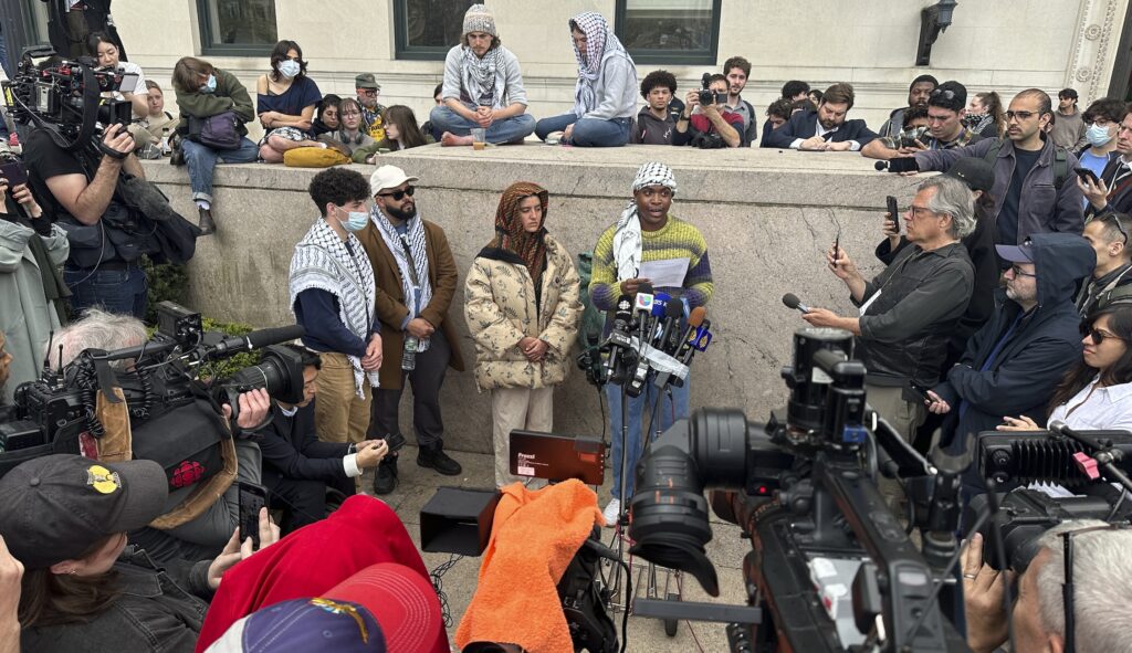 Demonstration leader Khymani James, center right, and other protesters address the media outside a tent camp on the campus of Columbia University in New York on Wednesday, April 24, 2024. Students at a growing number of U.S. colleges are gathering in pro-Palestinian encampments with a unified demand to end investments supporting Israel’s war in Gaza. It’s inspired by a demonstration at Columbia University last week that resulted in dozens of arrests. (AP Photo/Ted Shaffrey)