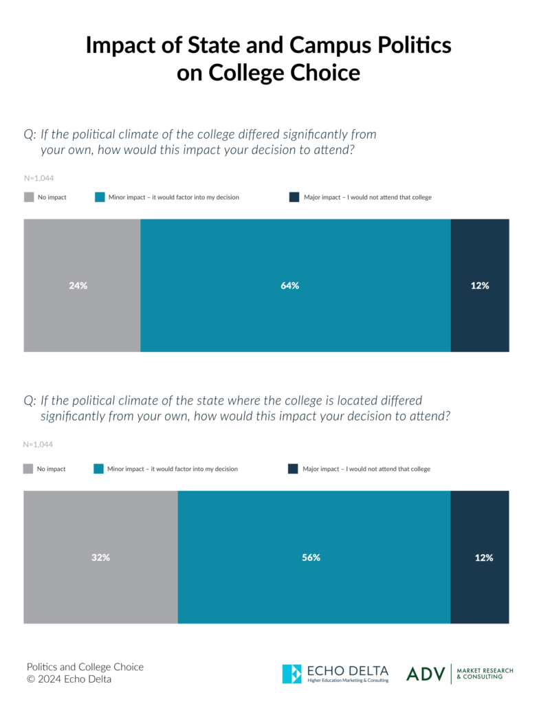 The study, done by education marketing and consulting firm Echo Delta, found that 76% of high school students take state and campus political climate into consideration before deciding where to continue their educations. Weighed against other considerations, such as cost, education quality, and school location, political concerns account for about 20% of the final decision, according to the report.