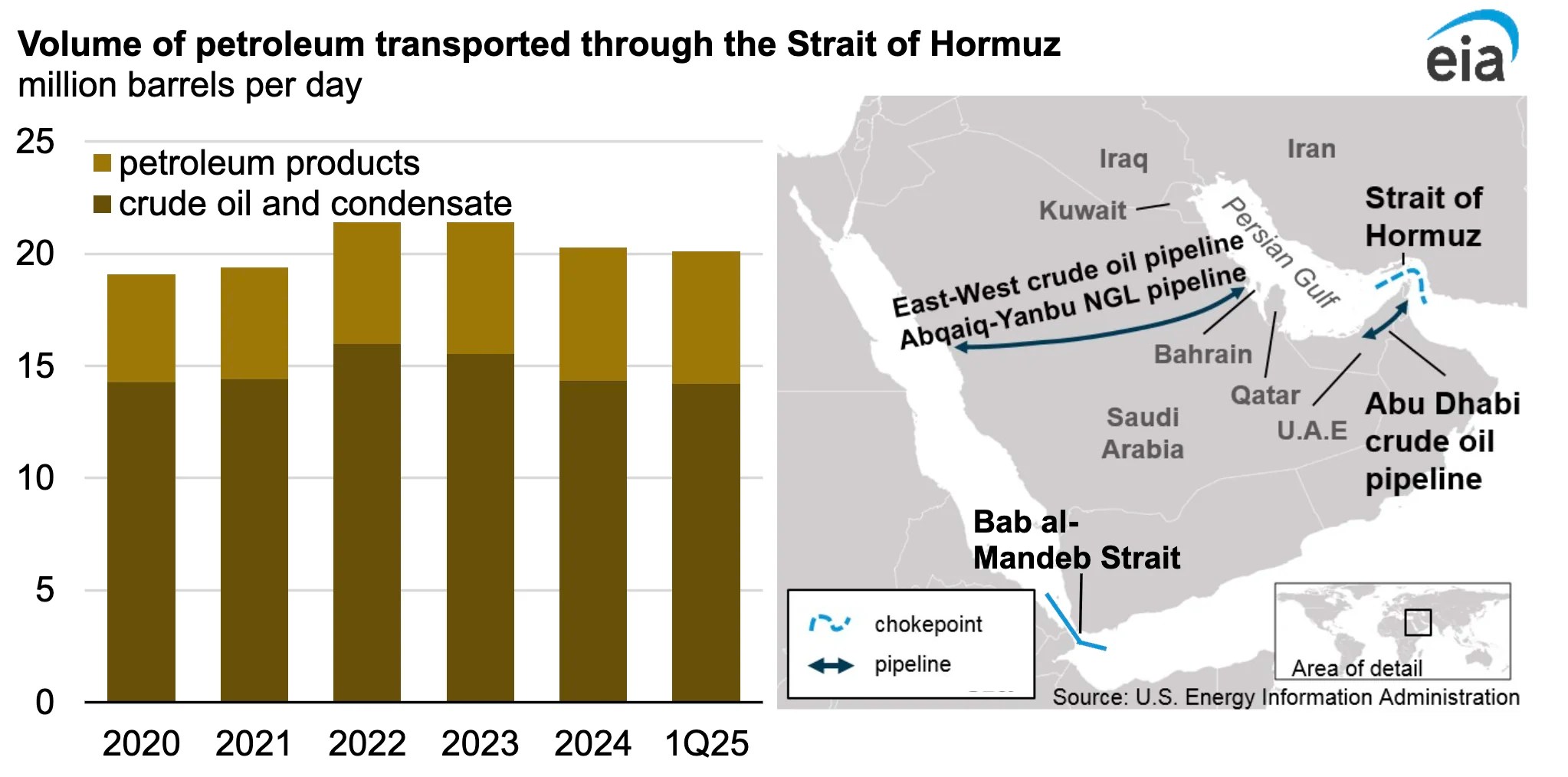 Iran is one of the top 10 oil producers worldwide and sits along the narrow Strait of Hormuz. This water route is critical to the global transportation of crude oil, as roughly one-fifth of global daily oil production passes through the strait every day.