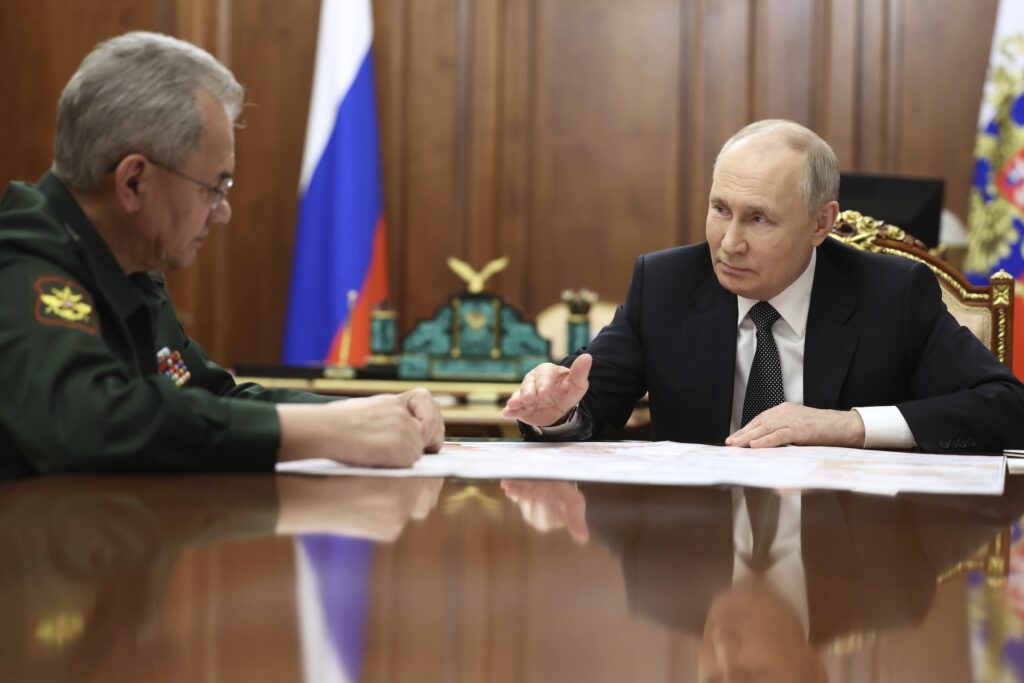 Russian President Vladimir Putin, right, speaks to Russian Defense Minister Sergei Shoigu during their meeting at the Kremlin in Moscow, Russia, Tuesday, Feb. 20, 2024. (Alexander Kazakov, Sputnik, Kremlin Pool Photo via AP)