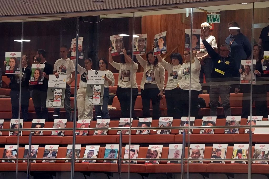 Relatives of hostages kidnapped by Hamas in Gaza protest during a session of the Knesset, Israel’s parliament, in Jerusalem, Monday, Nov.18, 2024.(AP Photo/Ohad Zwigenberg)