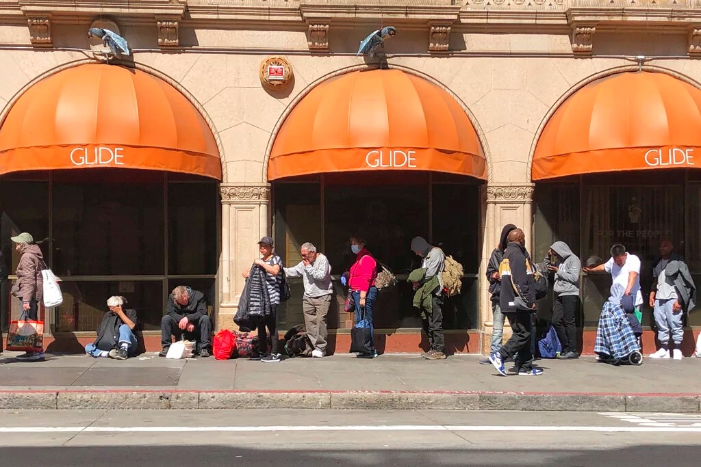 People line up outside GLIDE, a charity that offers free meals, shelter, and other services to the homeless, Friday, March 20, 2020, in San Francisco.(AP Photo/Juliet Williams)