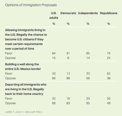 Gallup asked 3,270 adults three questions: Do they support a path to citizenship, building of the wall, and deportation. It found that 62 percent of Republicans support the wall. But even more, 76 percent support a path to citizenship. And showing how the Republicans are split over immigration policy, 50 percent support deporting illegals and 48 percent oppose.
