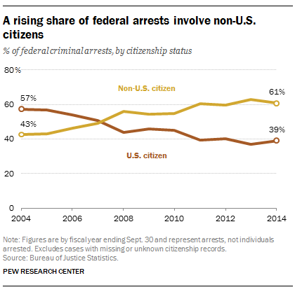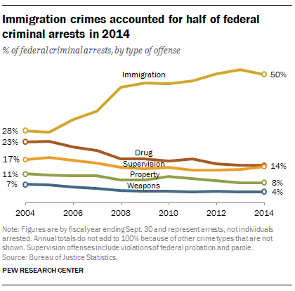 “Half of the 165,265 total arrests made by the federal government in fiscal 2014 – the most recent year for which statistics are available – were for immigration-related offenses, such as crossing the border illegally or smuggling others into the United States. A decade earlier, immigration-related offenses accounted for 28 percent of all federal arrests,” said Pew’s Fact Tank.