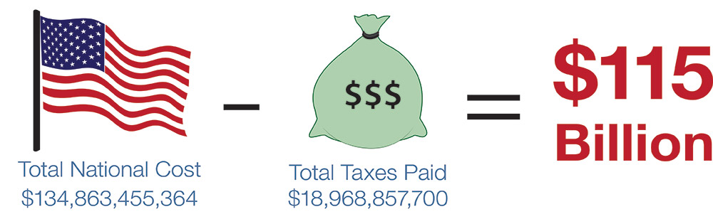 - The staggering total costs of illegal immigrants and their children outweigh the taxes paid to federal and state governments by a ratio of roughly 7 to 1, with costs at nearly $135 billion compared to tax revenues at nearly $19 billion.