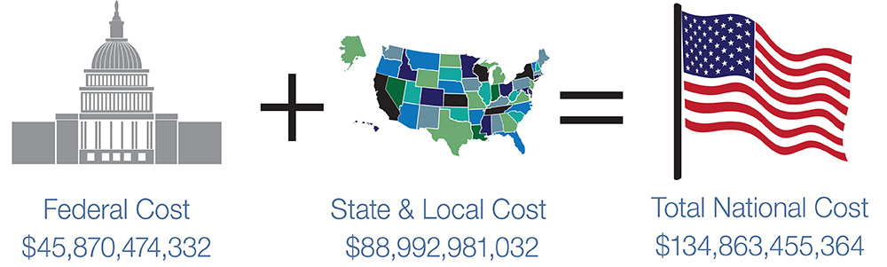 State and local governments are getting ravaged by the costs, at over $88 billion. The federal government, by comparison, is getting off easy at $45 billion in costs for illegals.