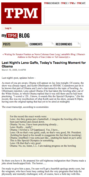 And on the topic of belittling those with disabilities, it’s worth noting that a post that appeared on TPM’s blog in 2009 actually went to great lengths to downplay furor over President Obama joking that he bowled like he was in the Special Olympics.