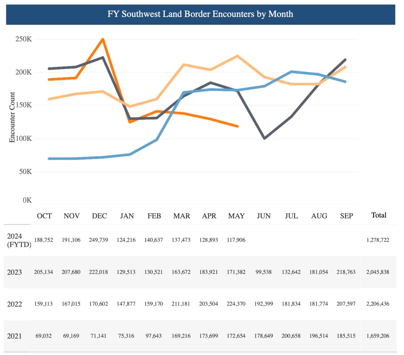 Arrests hung between an average of 30,000 and 50,000 people intercepted each month in the decade leading up to 2021, but in the three years and four months of the Biden administration, they have largely stayed between 120,000 and 250,000 arrests per month.
