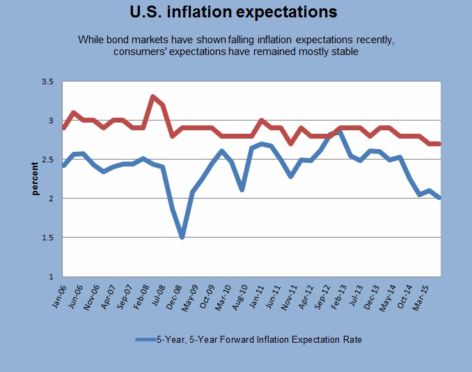 There are two ways to gauge inflation expectations. One is by looking at surveys of people, such as the University of Michigan’s survey of consumers. Those surveys show that Americans expect inflation to be stable.