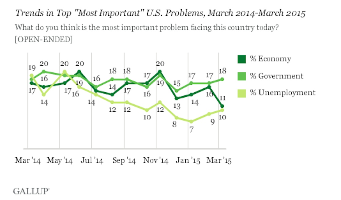 Healthcare — the third most important problem in February 2014 with 10 percent — dropped down to 7 percent this year. Immigration was the only problem that has increased over the same time, from 6 percent to 7 percent.