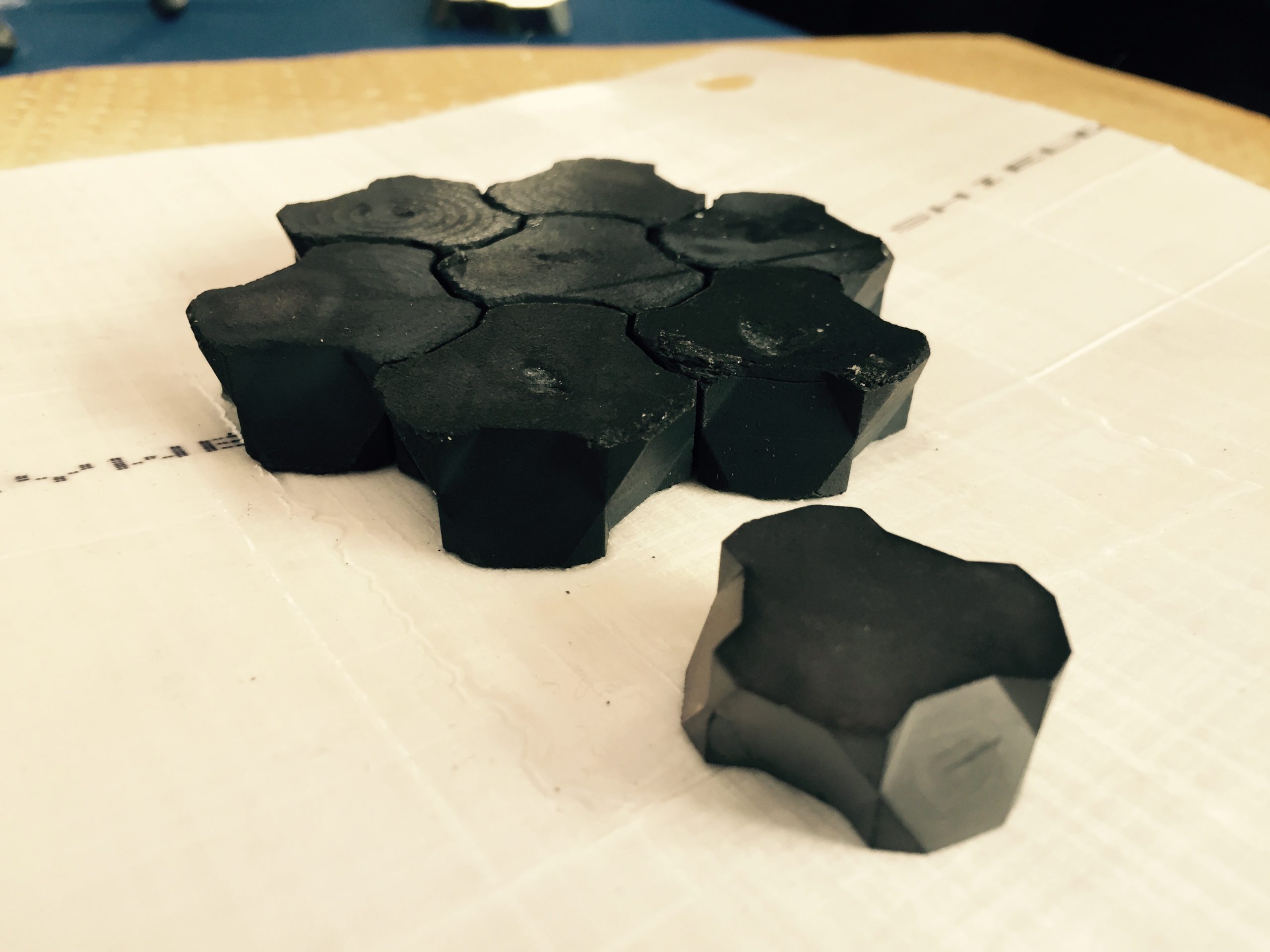 “Very common structure used in armor is a hexagonal, a six-sided piece, because its has essentially three-fold symmetry,” Gamache said. “Because I knew it had three-fold symmetry, I said, ‘I want to start making it interlocking.’ So I started machining down the edges.”